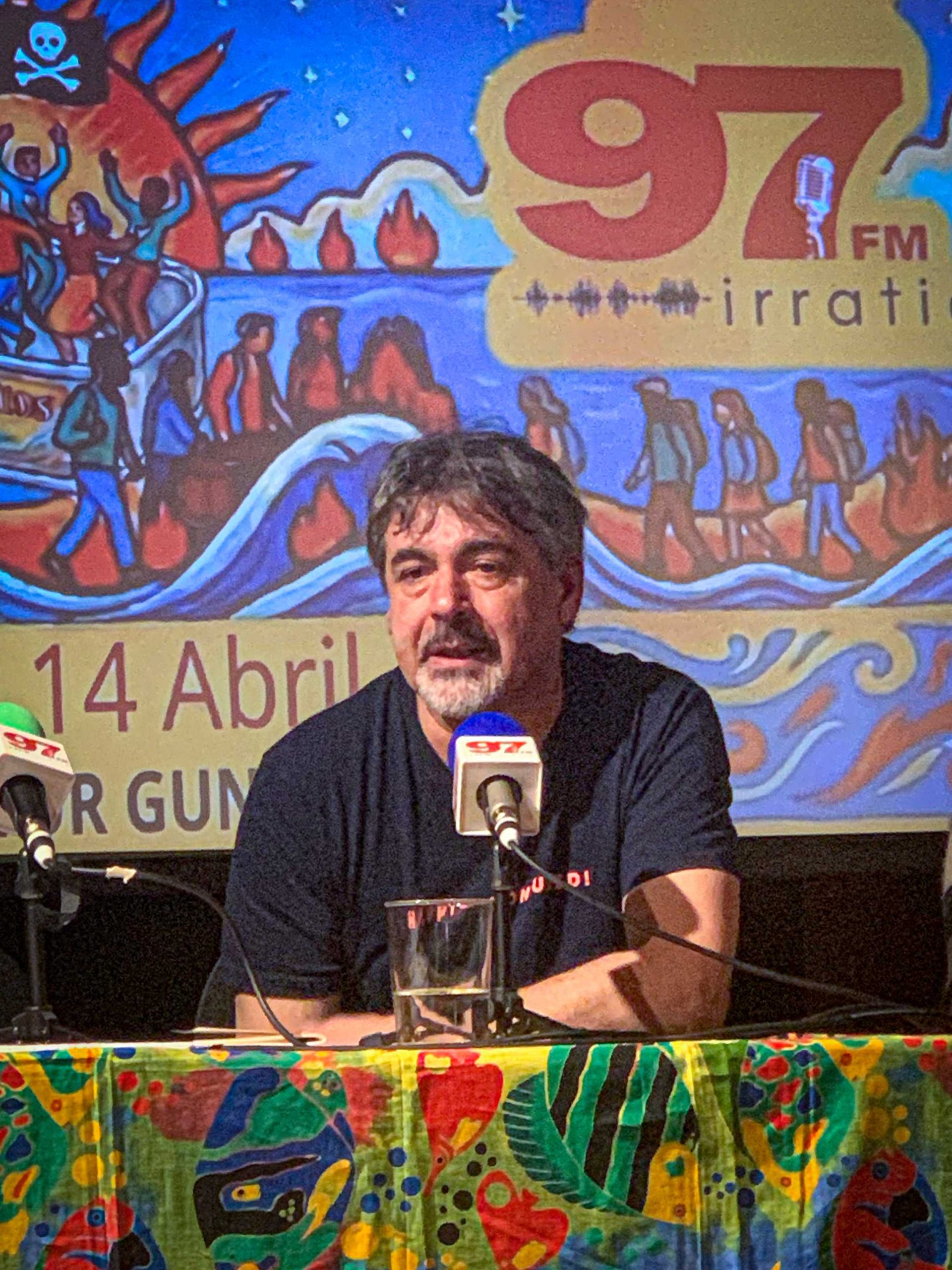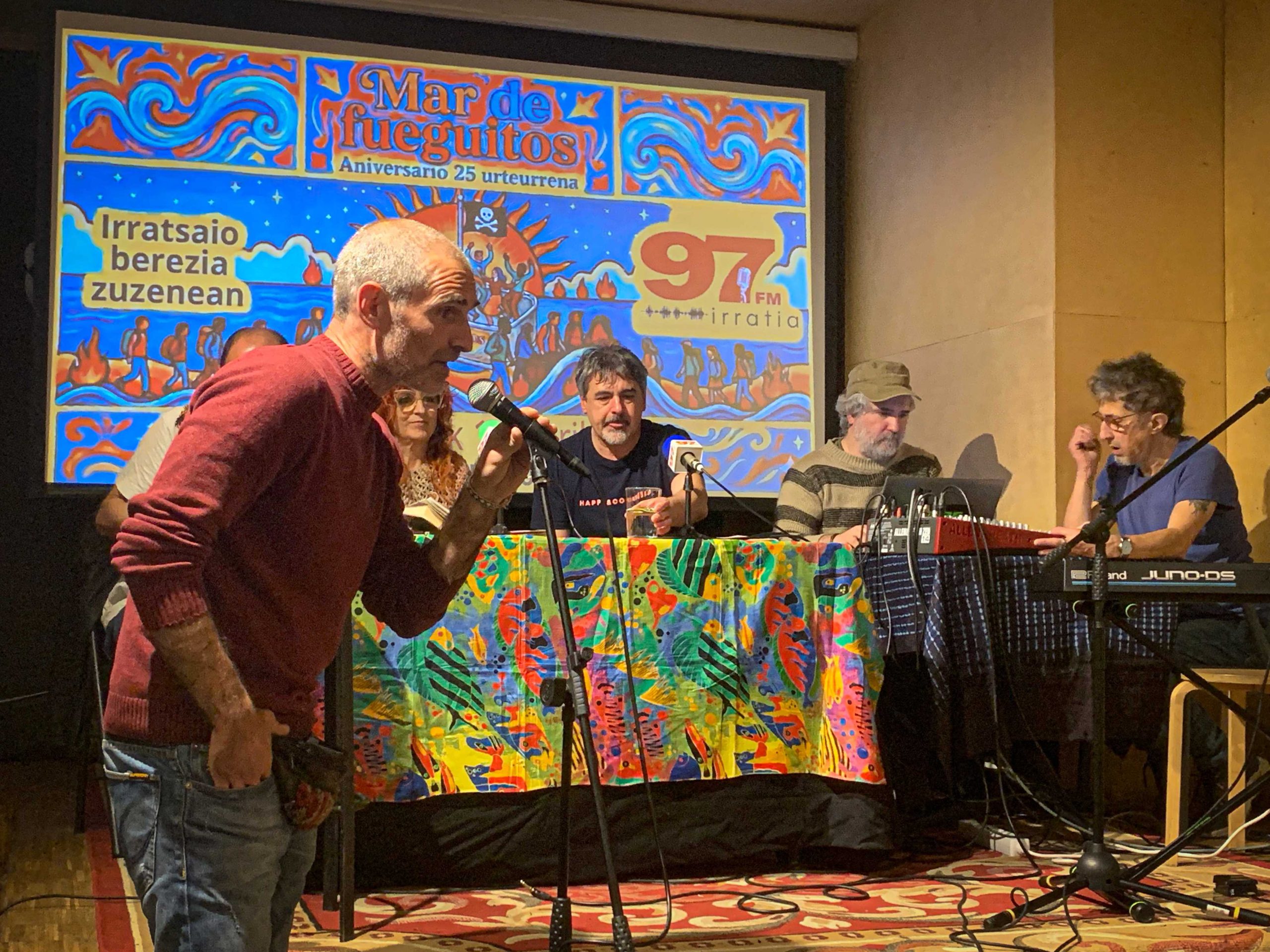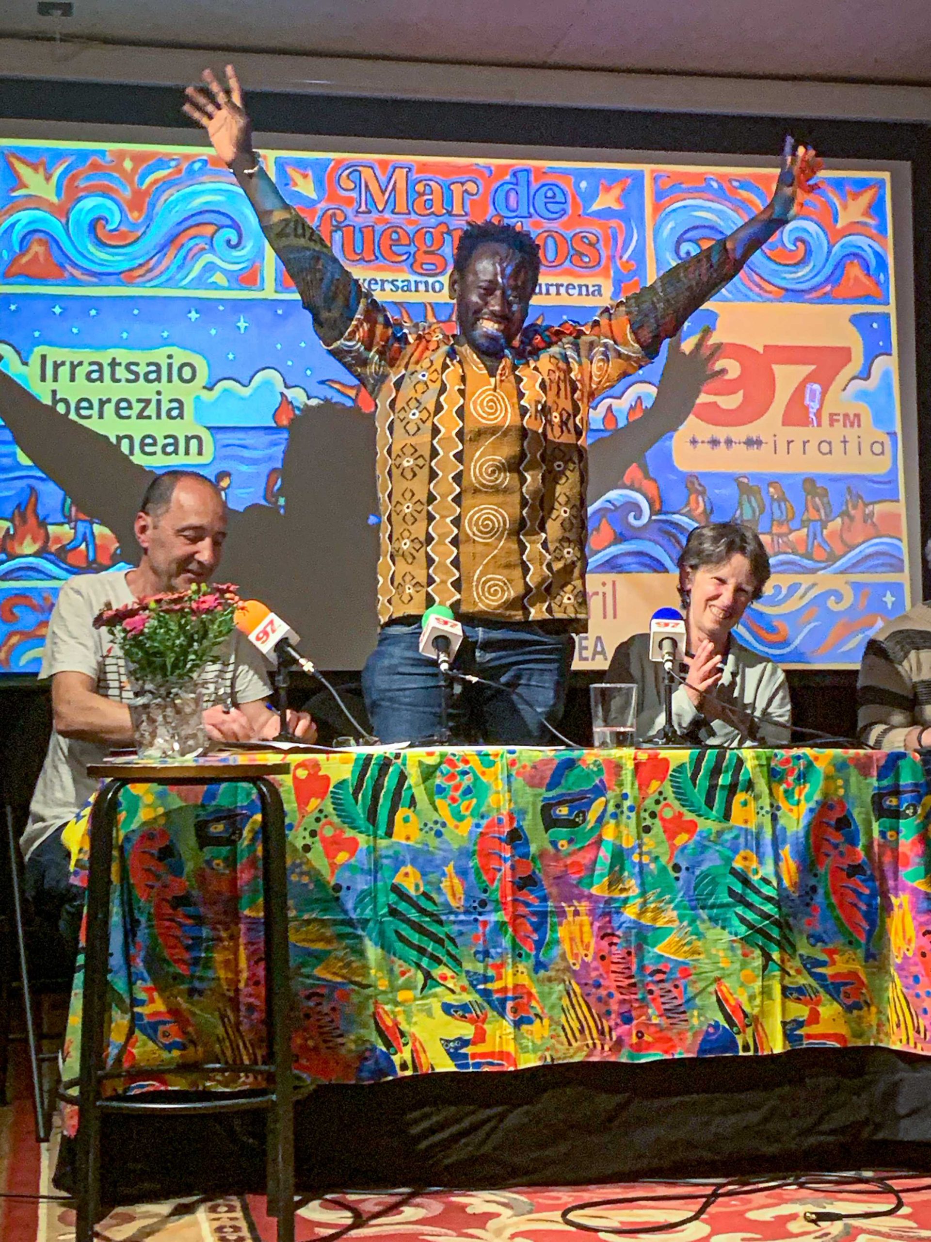 El fotógrafo Xabier Aresti también participó en nuestro programa especial en directo desde Bira Kultur Gunea, en el Casco viejo de Bilbao, para celebrar los primeros 25 años de Mar de fueguitos. Como sabéis, entrevistamos a Catherine Verbrugen, de la Plataforma Ongi Etorri Errefuxiatuak, y a Ilyasse Ba, soldador senegalés que hace diez años emigró a tierras vascas. Además, escuchamos varios relatos de Eduardo Galeano, Hind Joudah, David González y Víctor González, en la voz de María Uriarte, y disfrutamos con las actuaciones musicales del poeta José Blanco y de la banda Soulnettes. Aquí podéis ver algunas de las fotos del festejo. Mil gracias por compartirlas, Xabi.